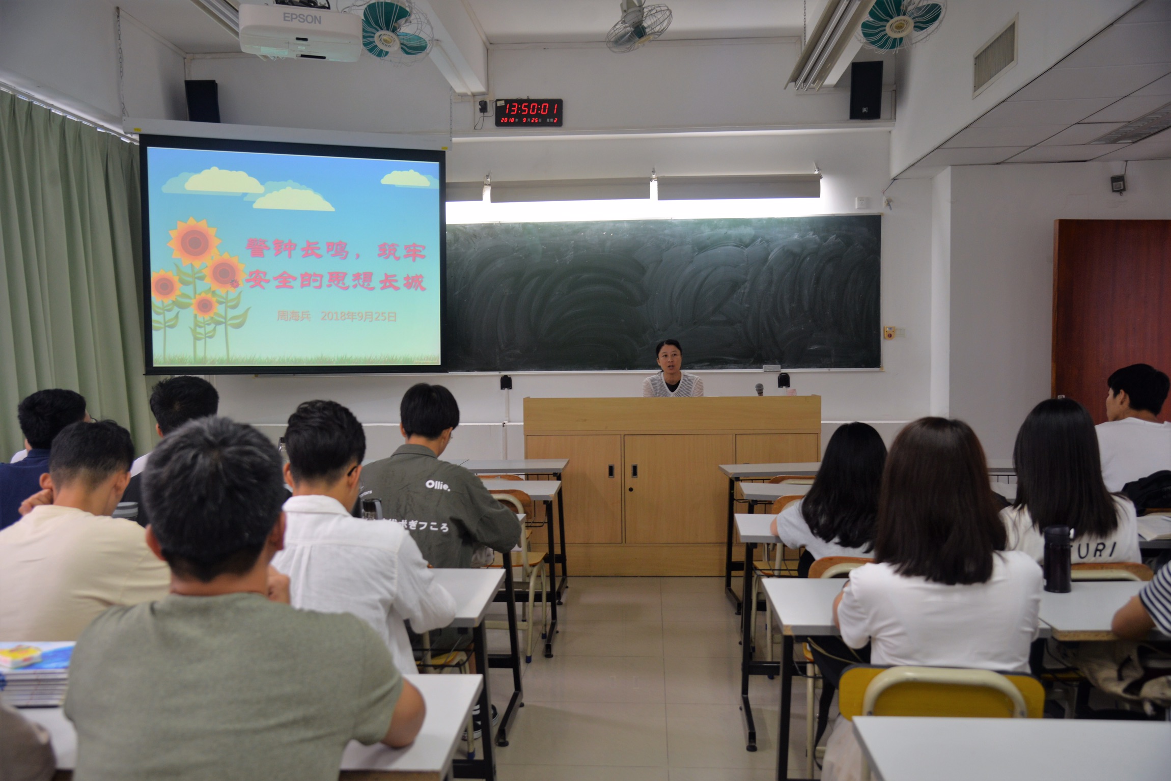 党委书记周海兵在文新214为化工172班上主题为“警钟长鸣,筑牢安全的思想长城”的思想政治第一课。