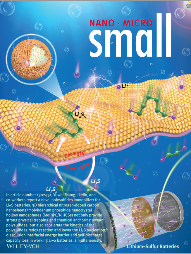 分析科学技术研究中心牛利教授团队,通过有机-无机杂化策略成功将三维氮掺杂碳纳米片/磷化钼纳米晶中空纳米球修饰到商业化电池隔膜上,用来解决锂硫电池存在的多硫化物穿梭和自放电的问题。该修饰隔膜不仅可作为多硫化物的固定剂对多硫化物提供强烈的物理、化学吸附,而且也可以作为电催化剂用来加快多硫化物之间快速的相互转化,并且能够降低硫化锂的形核/溶解界面能、抑制电池的自放电行为。该研究成果以封面论文的形式发表在Small上(IF=10.85),张玉微教授、牛利教授为改论文通讯作者,成人影院