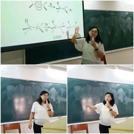 袁杨老师参赛的课程是“食品专业英语”,他在ppt上展示了花样繁多的食物图片,用英文的讲解食物词汇的来源或用法,风趣幽默的讲解、自然大方的教态是袁老师课堂教学的最大亮点;杨伟老师主讲的是“化工原理”课程,他引入了我国古代先民“传统天锅蒸馏酒”的例子,为大家介绍了精馏原理及过程,让生涩的概念变得通俗易懂;史文静老师重点讲解了“烯烃的化学性质”,以例题解析加以强化知识要点,课堂教学内容由浅入深,循序渐进;毛桃嫣老师就“基本曲面的投影特征”和“基本曲面立体表面上点和线的投影”展开讲述,生动的ppt,巧妙设计课堂内容,善于使用小型的教具辅助教学,使抽象的理论瞬间变得形象化、可感化;刘锋钢老师的授课主题是“原电池”,他以原电池的结构为切入点展开了讲解,整个教学过程概念清晰,讲解透彻,将复杂的电化学知识娓娓道来。