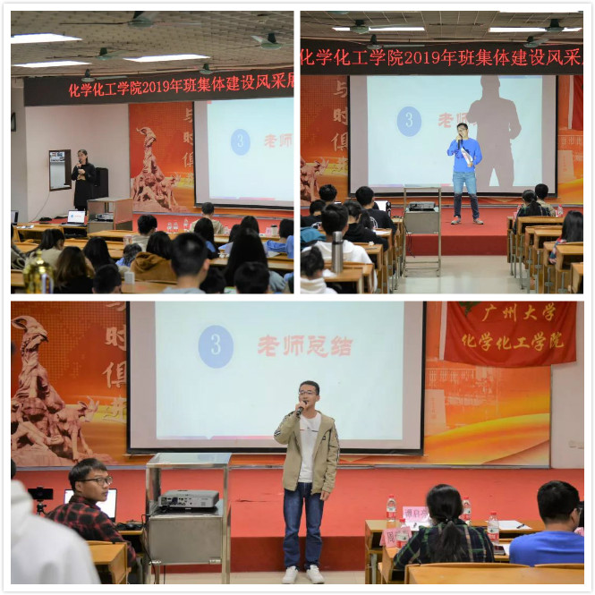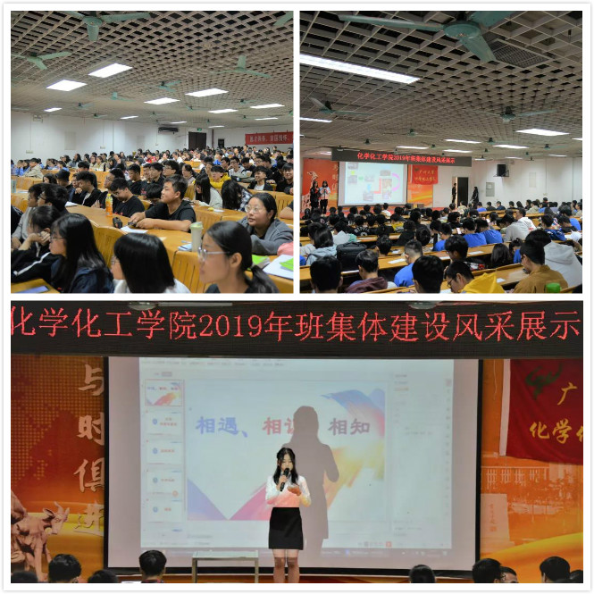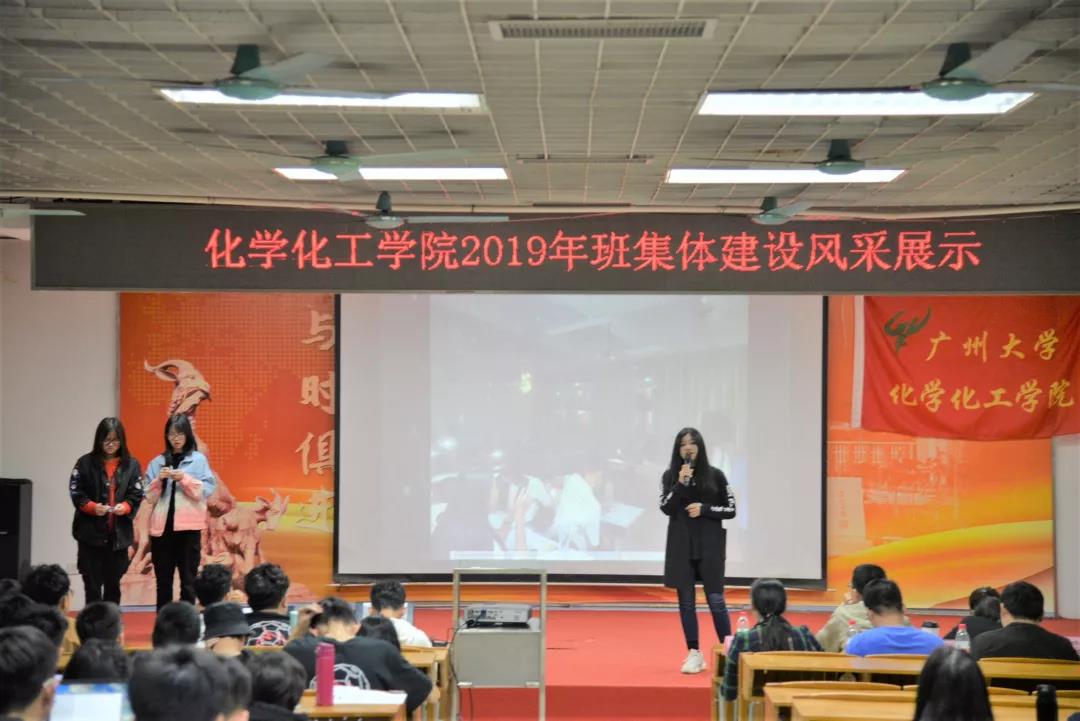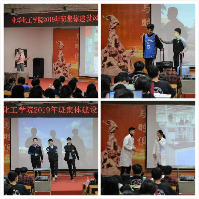化工194班级代表以讲解PPT的形式展示他们的风采,随后用情景剧“我们的广大故事”和改编版《成都》表演出他们的广大情结。