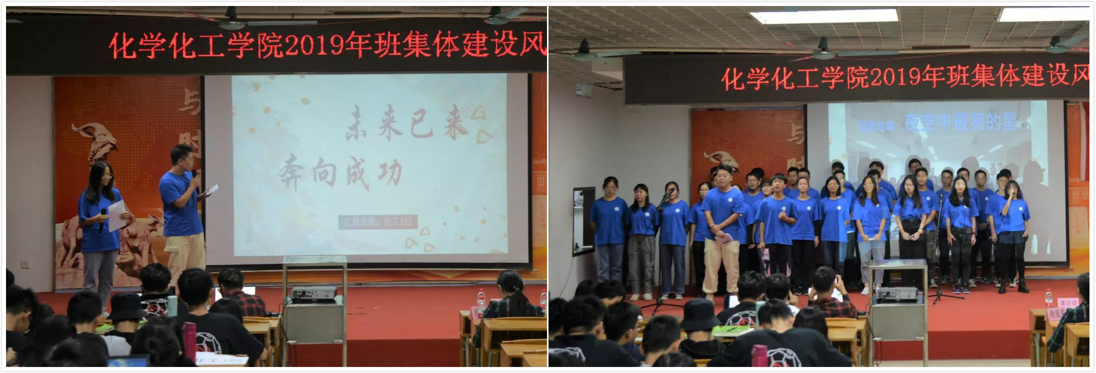 化工193以两位班长的PPT展示为开场,接着以班级合唱《夜空中最亮的星》,带动全场齐唱,将气氛推向了高潮。