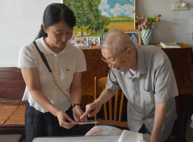 ▲陈蔚然向学院党委书记周海兵介绍老照片