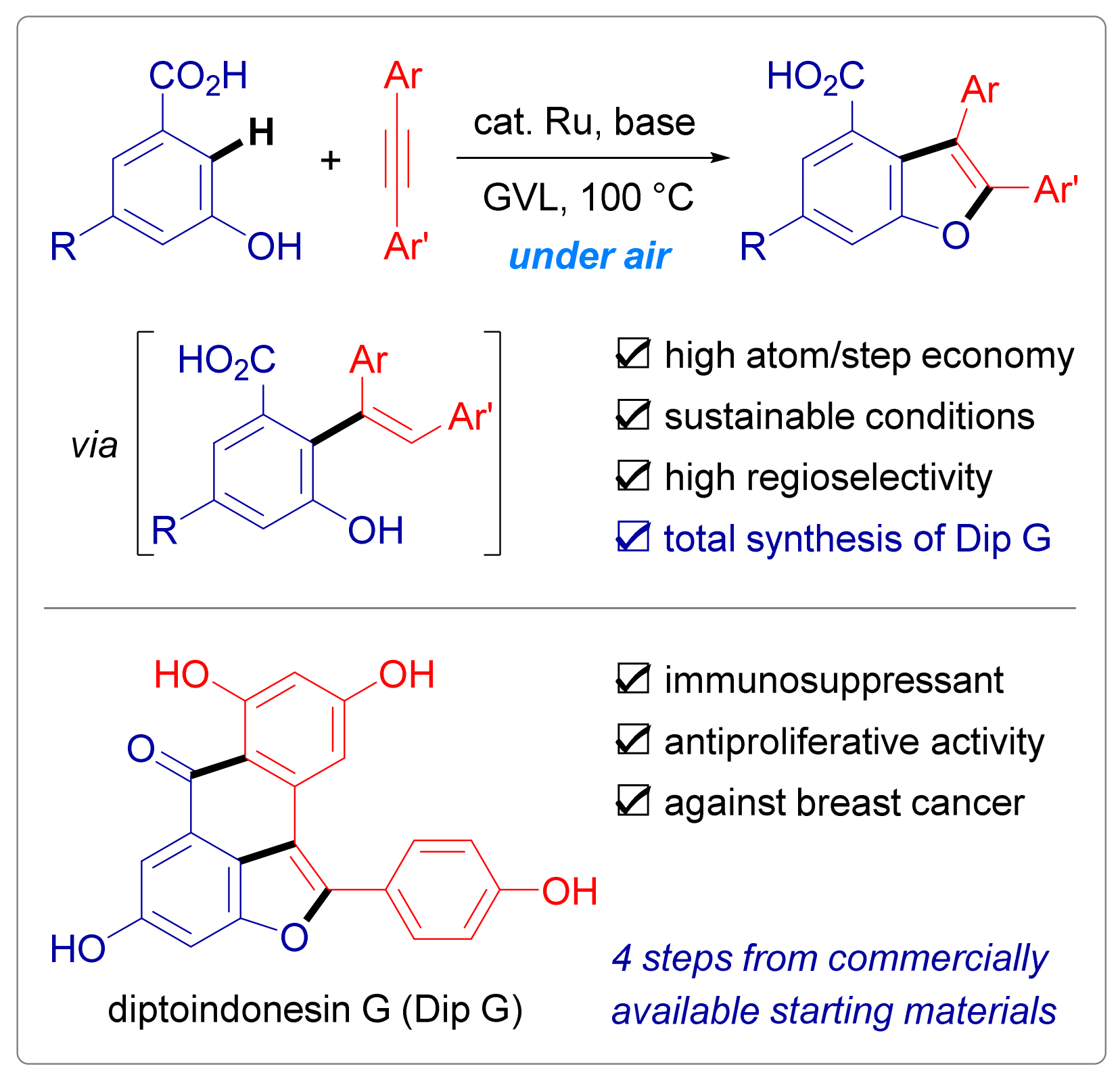 机理研究表明,反应经由串联的Ru催化碳氢键烯基化和氧化环化反应实现,底物中的羧基和羟基互相配合,实现了温和条件下的选择性碳氢键切断与杂环构建。以该反应作为关键步骤,团队成员实现了天然产物diptoindonesin G (Dip G)的四步全合成和类似物库的构建,这是目前该类并杂环骨架最高效的合成策略。Dip G及其类似物已被证明具有显著的消炎和抗癌活性,这进一步展示了该方法的应用前景。此外,使用间二羟基苯甲酸反应还能得到一类新型的“蝴蝶形”苯并二呋喃骨架,进一步丰富了产物的多样性。