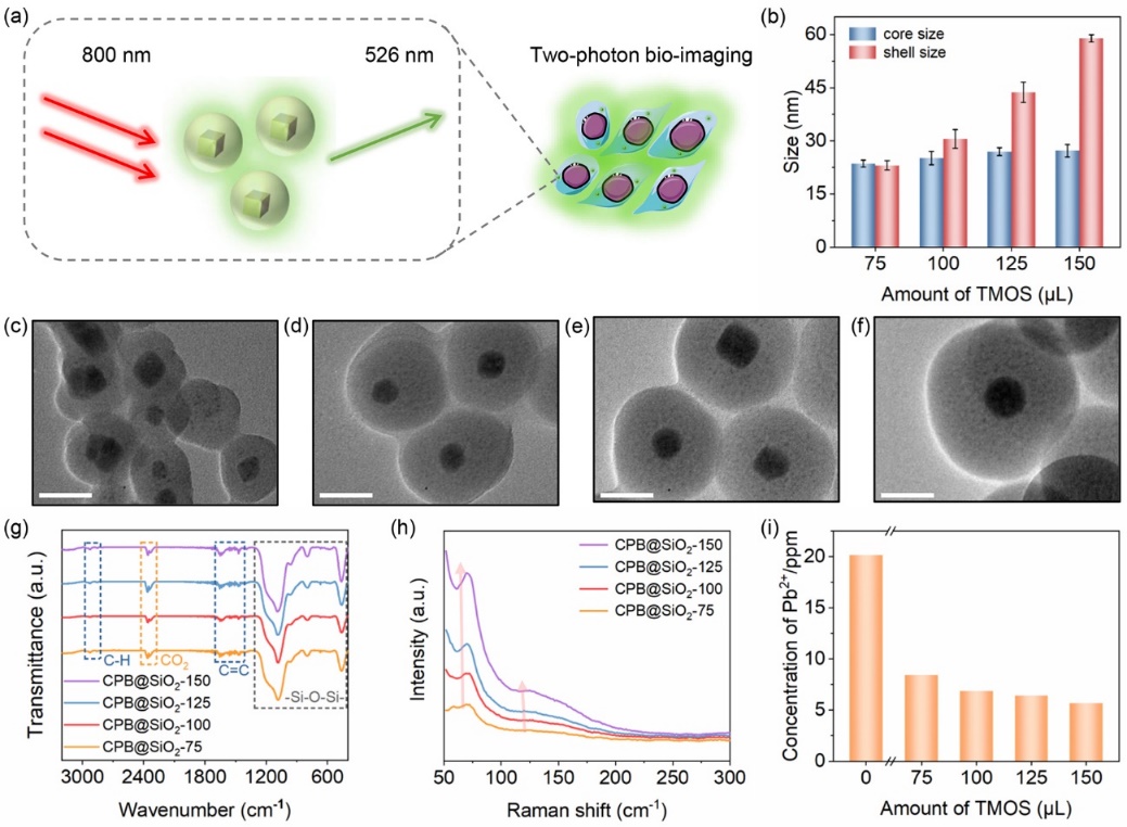 图1 (a) CPB@SiO2核壳NCs用于双光子生物成像的示意图;(b) TMOS含量与核壳尺寸的关系;(c)CPB@SiO2-75、(d) CPB@SiO2-100、(e) CPB@SiO2-125和(f) CPB@SiO2-150 NCs的透射电镜图像,比例尺是50 nm;(g) CPB@SiO2 NCs的FTIR光谱;(h)室温下CPB@SiO2NCs的拉曼光谱;(i)上清液中Pb2+的浓度。