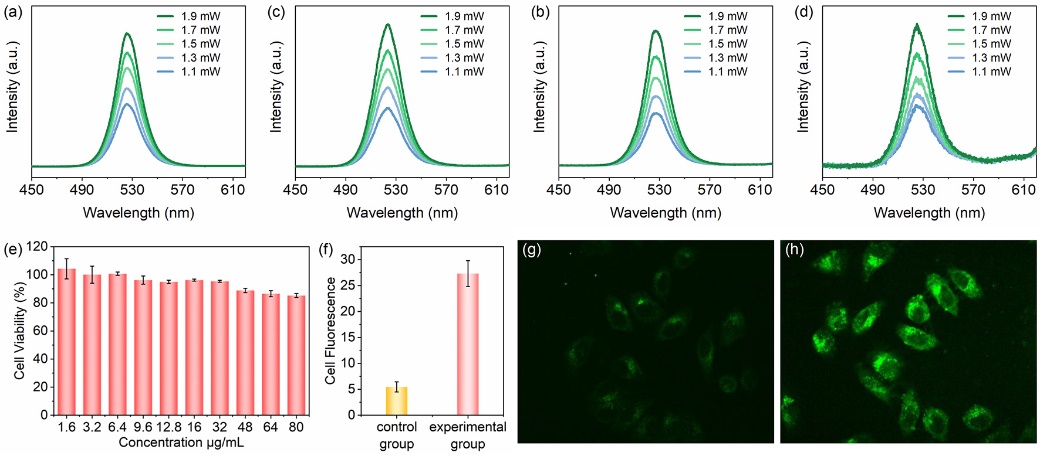 图2 800 nm飞秒激光激发下(a) CPB@SiO2-75, (b) CPB@SiO2-100,(c) CPB@SiO2-125, (d) CPB@SiO2-150 NCs在不同激发功率下的双光子荧光光谱;(e)不同浓度CPB@SiO2-100 NCs培养HepG2细胞24 h后的细胞活力;(f)实验组和对照组(含或不含CPBr@SiO2-100 NCs培养) HepG2细胞的累计荧光强度;(g)对照组和(h)实验组HepG2细胞在800 nm飞秒激光下的双光子荧光成像图。