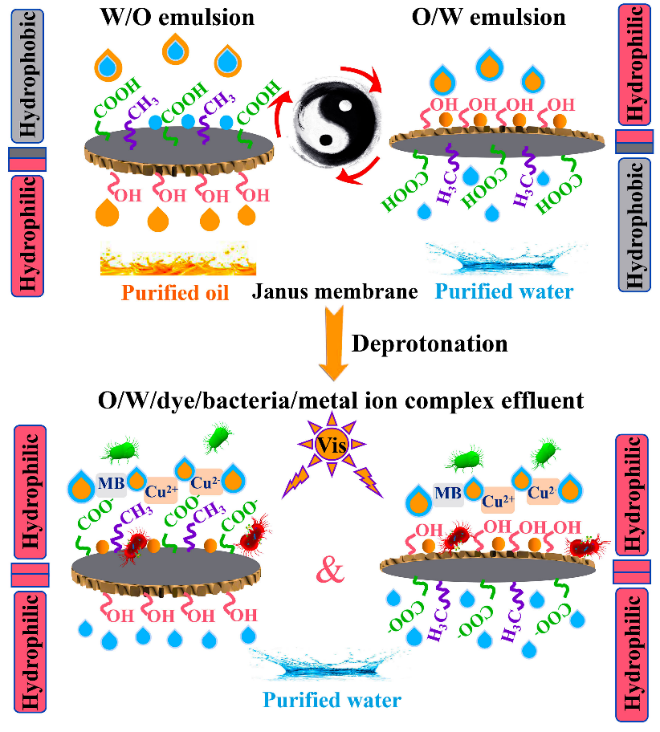 为攻克这一难题,团队设计了一种响应型的Janus PVDF复合膜,该膜具有选择润湿性,赋予特定的按需分离能力,能够实现油包水和水包油乳液体系的分离;又具有静电吸附和光降解功能,实现有机染料的分离和降解;膜的抗菌性和低黏附性有效将细菌杀灭和解决了工业界膜的微生物和油污染问题。