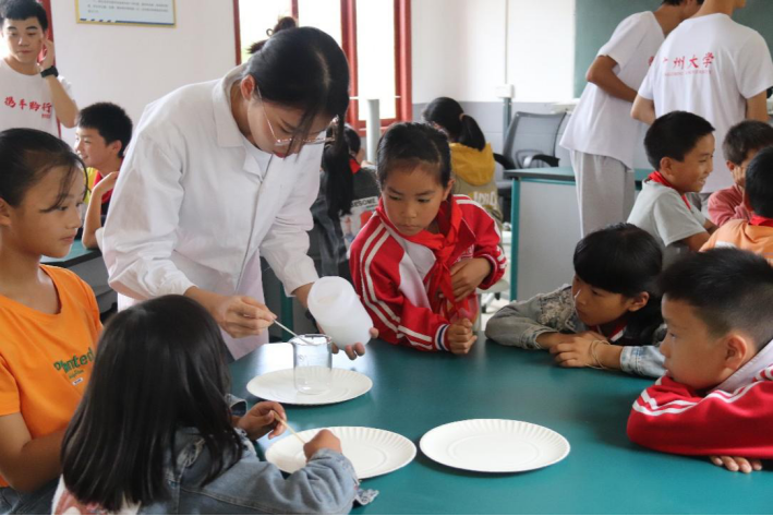 的本科生及研究生骨干组成,分别来自化学、化工、应用心理学、数学、新闻传播学等多个专业,理工科专业特色突出,充分把“专业实践+”融入思政学习教育。实践团深入贵州省关岭布依族苗族自治县,到山区小学、到乡村、到社区,通过实地调研考察,将科教思政与助力社会发展深度融合,展现新时代学子良好的社会形象。