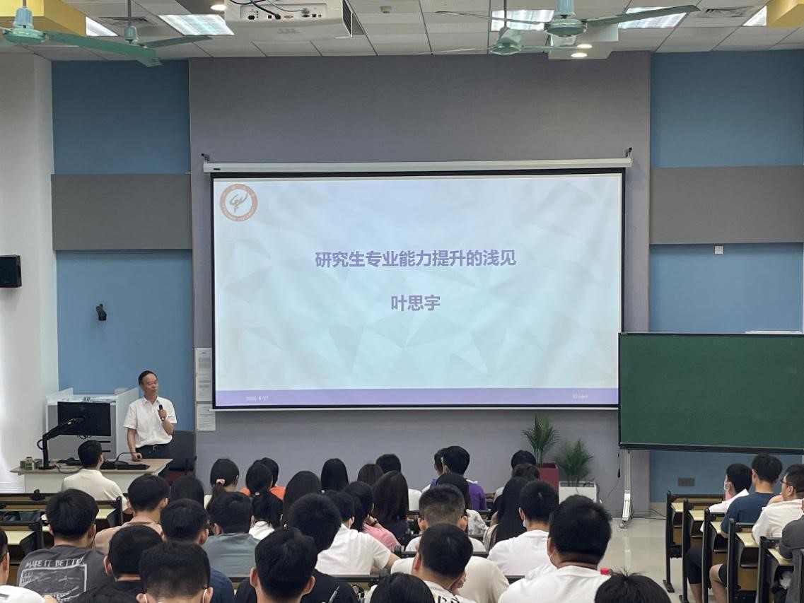 叶思宇院士的讲座主题为“研究生专业能力提升的浅见”。叶院士从自身成长故事入手,针对研究生阶段如何提升专业能力和科学素养,与同学们分享了个人的理解和感悟。他认为,研究生应该聚焦国家战略重要实际问题和国际前沿重要科学问题,了解产业链和学术链的全貌,找到关键切入点来选择研究课题,大胆假设,不放过实验细节,紧抓特别的实验现象,深入挖掘现象背后的科学原理。研究生要与团队成员精诚合作,将基础研究成果推向实际应用,最终实现技术突破,解决国家‘卡脖子’问题。他希望同学们在研究生阶段要珍惜大好时光,真学本领,学真本领,获得应有的个人成长。