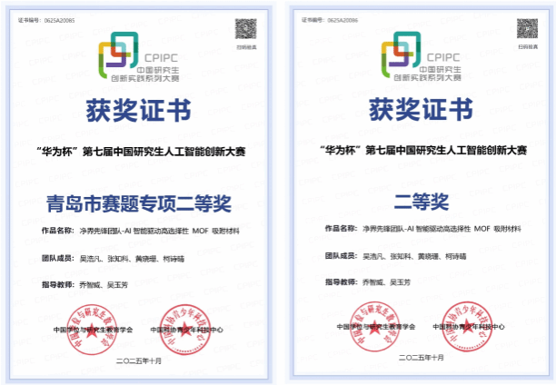 净界先锋团队面向国家“高端化、智能化、绿色化”制造战略,研发“AI智能驱动高选择性MOF吸附材料”。项目以Nobel级MOF为核心,率先构建千万级材料指纹数据库,融合高通量计算、迁移学习与分子模拟,打造“设计-预测-验证”闭环平台:①一键式VOCs吸附量预测软件,R⟡达0.951,毫秒级响应;②chat吸附剂自动化设计程序,已订阅盈利;③与深势科技公司共建的波尔空间站系统,上线5个月用户超600。平台可针对不同场景智能匹配最优金属中心、配体与拓扑,实现碱金属OMS比例提升41.7%。企业端已在三家环保公司落地,VOCs平均吸附效果提升218%,吸附剂利用率提升36%。项目已授权专利2项、申请10项,软著3项,一区论文6篇,为有毒有害气体治理提供了高效、低成本、可推广的AI+材料一体化解决方案。